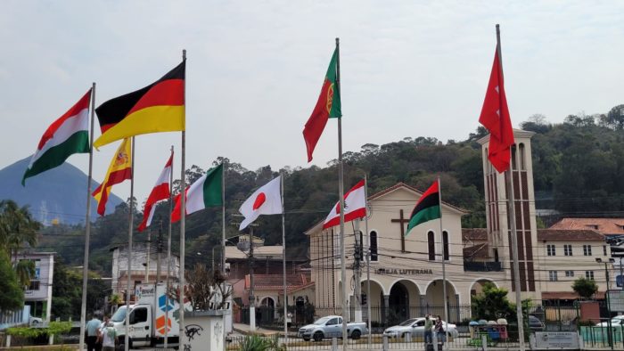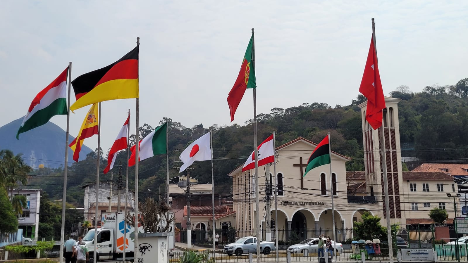 Os estandartes novos mostram o respeito de Nova Friburgo com os países colonizadores e também com os principais símbolos do município, estado e país.