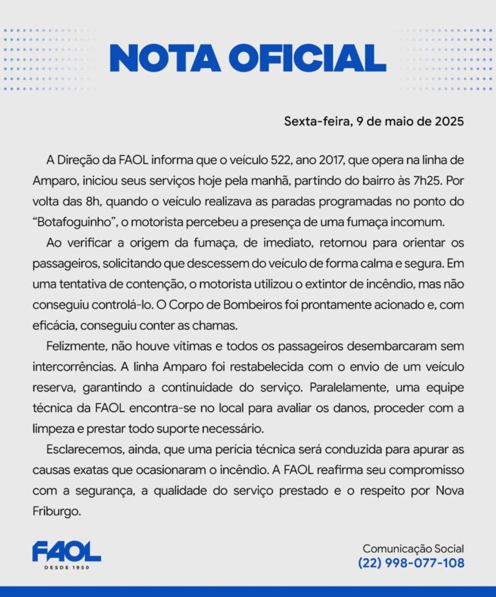 A perícia técnica da Polícia Civil – a pedido da Faol – foi acionada para esclarecer a causa do incêndio que destruiu o ônibus 522 (ano 2017) da empresa concessionária na manhã desta sexta-feira, 9/5.