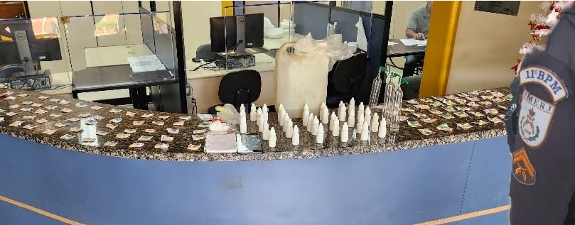 Ao todo, foram apreendidos 105 papelotes de cocaína, um galão contendo cinco litros de black lança e mais 37 frascos da mesma droga, além de um caderno de anotação do tráfico e material para endolação.