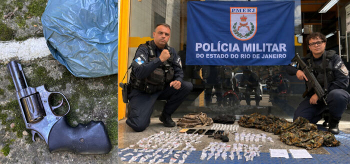 “Policiais militares do 11º BPM agiram rápido e prenderam três homens na Estrada Manoel Homem, em Boa Esperança, Lumiar, Nova Friburgo, sexta-feira, 24/4. Foram apreendidos um revólver calibre 38, 6 munições, 161 unidades de cocaína, 15 unidades de maconha, 17 unidades de skank, 2 unidades de anfetamina, trajes camuflados, celulares e dinheiro em espécie. Dois suspeitos são oriundos do município de Itaboraí. A ocorrência foi apresentada na 151ª DP”, diz a publicação do 11º BPM nas redes sociais.
