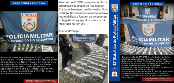 Através de suas redes sociais, o 11º BPM (Nova Friburgo) divulgou três recentes apreensões de drogas no município: Cordoeira, Catarcione e Alto de Olaria, além da prisão em flagrante de um suspeito.