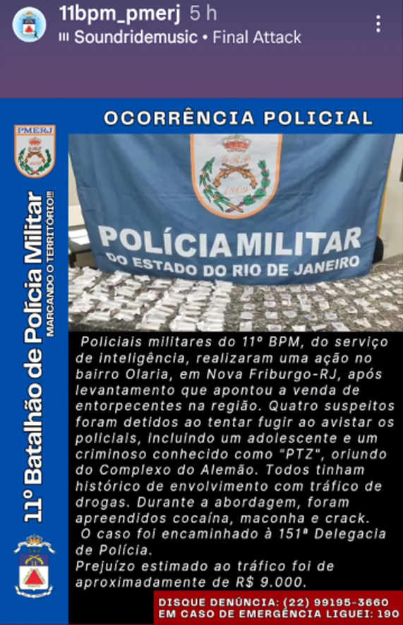 Ainda de acordo com o breve informe, quatro suspeitos foram detidos e encaminhados para a 151ª DP. Um deles é oriundo do Complexo do Alemão, na zona norte do Rio de Janeiro, onde foi realizada a megaoperação contra a facção criminosa Comando Vermelho (CV).