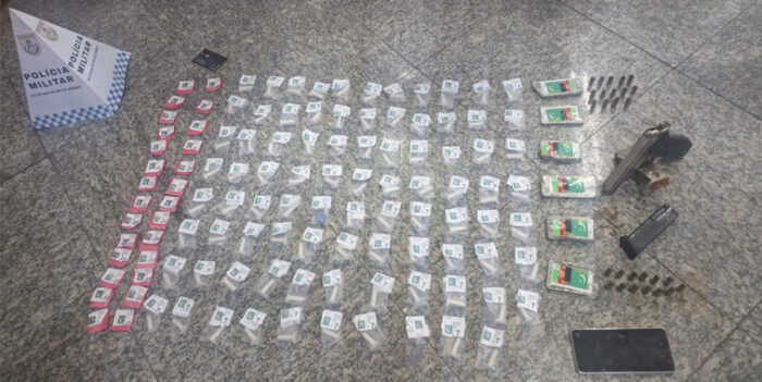 O breve informe, acompanhado de uma foto (mostrando ainda 27 munições apreendidas), também destaca que os agentes do 11º BPM apreenderam uma pistola, dois carregadores, celular e drogas na ação.