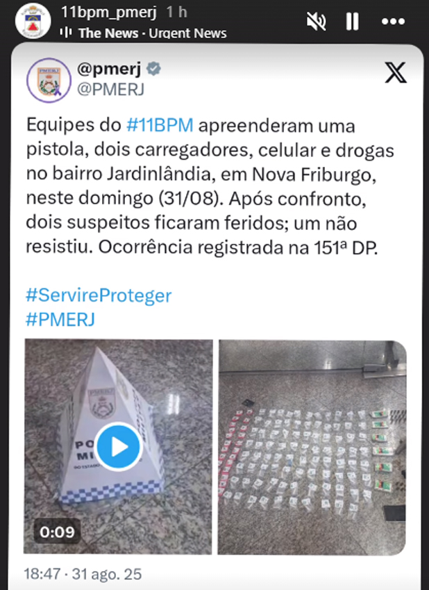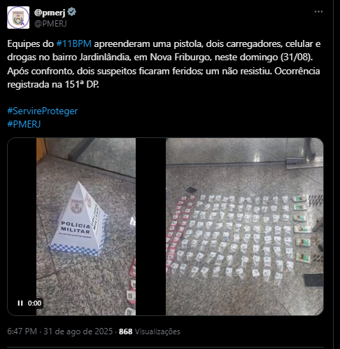 “Equipes do #11BPM apreenderam uma pistola, dois carregadores, celular e drogas no bairro Jardinlândia, em Nova Friburgo, neste domingo, 31/8. Após confronto, dois suspeitos ficaram feridos; um não resistiu. Ocorrência registrada na 151ª DP”, diz a íntegra da postagem.