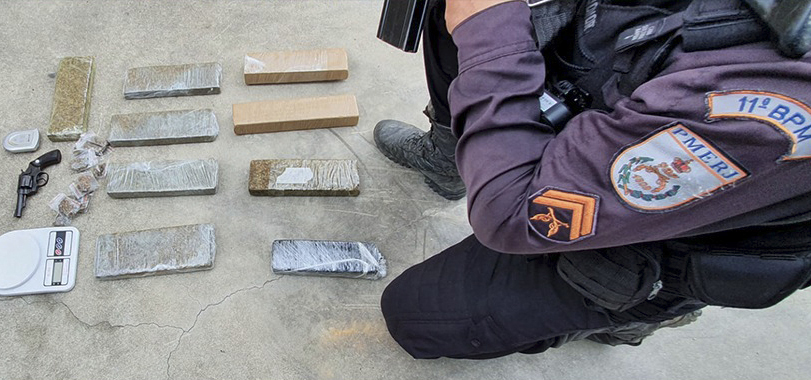 Dentro do veículo, os policiais apreenderam nove tabletes de maconha (cerca de sete quilos de drogas), 12 trouxinhas da mesma droga, duas balanças de precisão e, ainda, um revólver calibre 32.