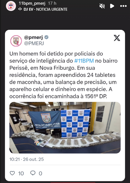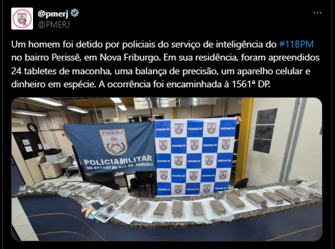 Um homem foi detido por policiais do serviço de inteligência do #11BPM no bairro Perissê, em Nova Friburgo. Em sua residência, foram apreendidos 24 tabletes de maconha, uma balança de precisão, um aparelho celular e dinheiro em espécie. A ocorrência foi encaminhada à 151ª DP.