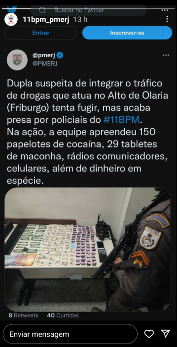 Através de postagem em sua página no Instagram, o 11º BPM divulgou ter efetuado a prisão de dois elementos envolvidos com o tráfico de drogas no Alto de Olaria.