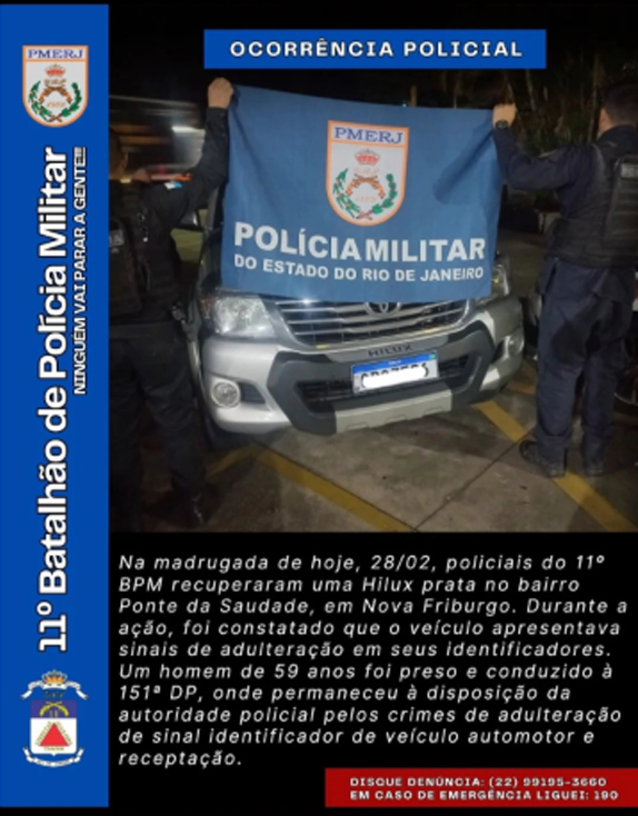 A informação foi publicada pelo 11º BPM (Nova Friburgo) em suas redes sociais: uma caminhonete Hilux, prata, foi apreendida na madrugada de sábado, 28/2, no bairro Ponte da Saudade, com sinais de adulteração em seus identificadores.