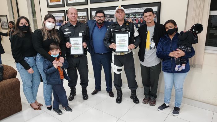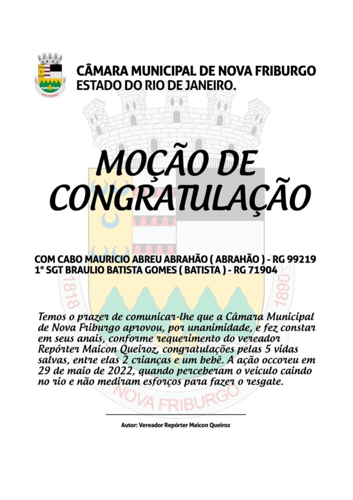 Notícia bacana! Os policiais militares sargento Batista e o cabo Abrahão foram homenageados, na noite desta terça-feira, 28/5, pela Câmara Municipal de Nova Friburgo por gesto de bravura: em 29/5, eles socorreram uma família que estava dentro de um carro que caiu dentro do Rio Bengalas, no distrito de Conselheiro Paulino. A homenagem foi iniciativa do vereador Repórter Maicon Queiroz e aprovada por unanimidade pelos colegas.