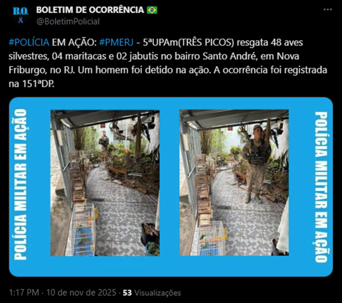 Através de suas redes sociais (via X), a Secretaria Estadual de Polícia Militar divulgou informação sobre ocorrência de ação ambiental em Nova Friburgo, no final de semana, com resgate de 52 pássaros silvestres engaiolados e dois jabutis.