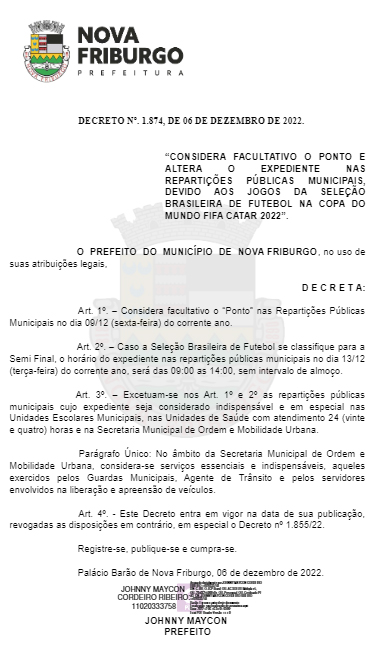 Através do decreto 1.874 (leia a íntegra abaixo), de 6/12, publicado no Diário Oficial Eletrônico, o prefeito Johnny Maycon decidiu considerar ponto facultativo nas repartições públicas municipais nesta sexta-feira, 9 de dezembro. Motivo: Jogo da seleção brasileira na Copa do Mundo.