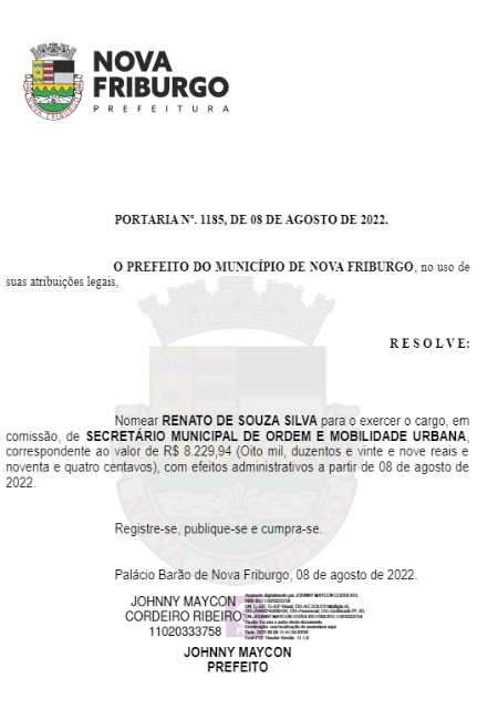 A efetivação de Renato de Souza foi publicada no Diário Oficial da Prefeitura desta segunda-feira, 8/8, com a assinatura do prefeito Johnny Maycon.