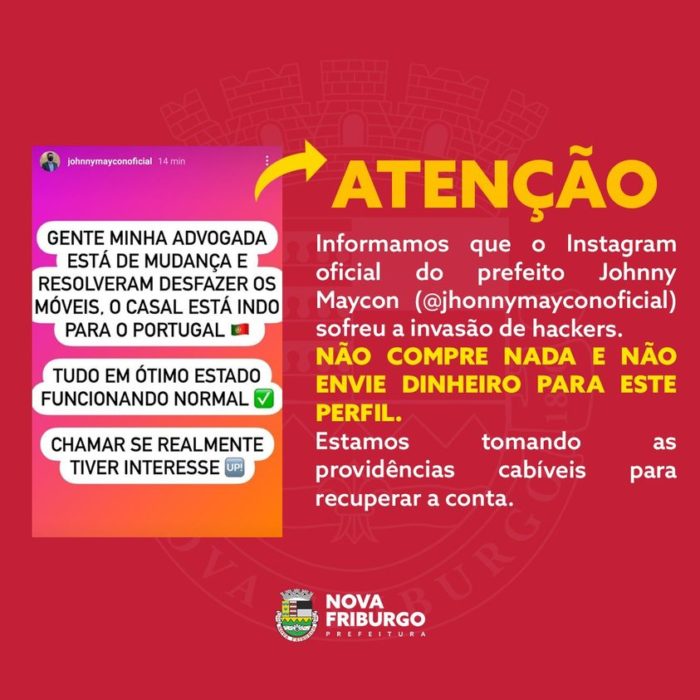 O prefeito de Nova Friburgo, Johnny Maycon (Republicanos), teve a sua conta oficial no Instagram invadida por hackers na tarde desta quinta-feira, 3/2.