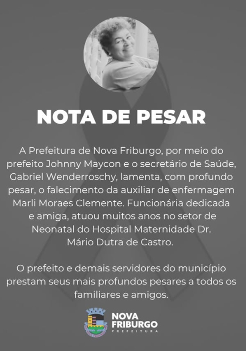 “A Prefeitura de Nova Friburgo, por meio do prefeito Johnny Maycon e o secretário de Saúde, Gabriel Wenderroschy, lamenta, com profundo pesar, o falecimento da auxiliar de enfermagem Marli Moraes Clemente. Funcionária dedicada e amiga, atuou muitos anos no setor de Neonatal do Hospital Maternidade Dr. Mário Dutra de Castro. O prefeito e demais servidores do município prestam seus mais profundos pesares a todos os familiares e amigos”.