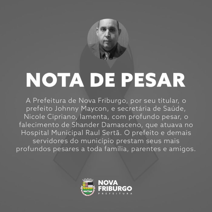 “A Prefeitura de Nova Friburgo, por seu titular, o prefeito Johnny Maycon, e secretária de Saúde, Nicole Cipriano, lamenta, com profundo pesar, o falecimento de Shander Damasceno, que atuava no Hospital Municipal Raul Sertã. O prefeito e demais servidores do município prestam seus mais profundos pesares a toda família, parentes e amigos”.