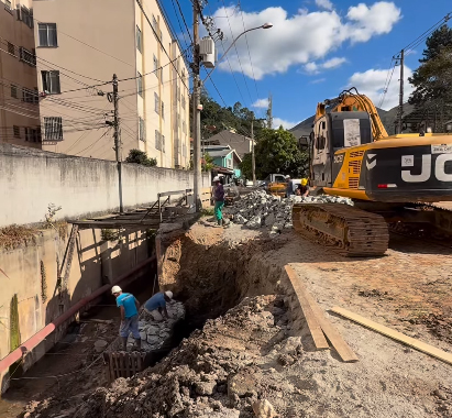 A Secretaria Municipal de Infraestrutura e Obras iniciou trabalhos de contenção na Rua Teresópolis, no bairro Vila Amélia, com a construção de um muro de gabião. É uma intervenção emergencial voltada à estabilização da via que ruiu recentemente.