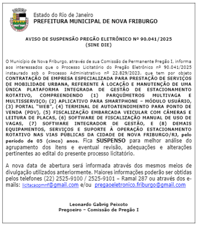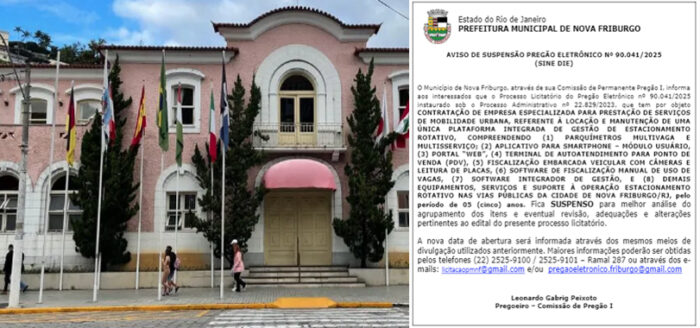 A Prefeitura de Nova Friburgo, através do Diário Oficial Eletrônico, publicou edital suspendendo a licitação para recriar o estacionamento rotativo nas ruas do município. A licitação estava marcada para esta quarta-feira, 7 de maio.