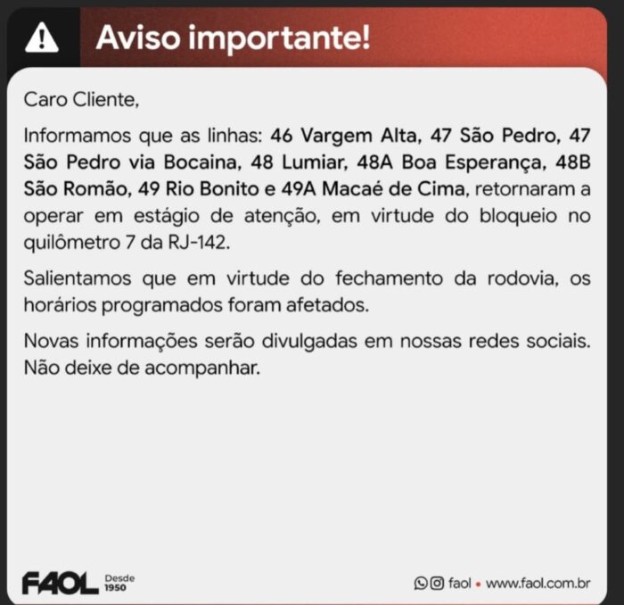 A Concessionária de transporte público Faol, através de suas redes sociais, informou que todas as linhas de ônibus que circulam na RJ-142 (Mury / Lumiar) foram afetadas (linhas suspensas temporariamente) na tarde desta quinta-feira, 13/3. Depois de uma hora, as linhas voltaram a circular em estágio de atenção.