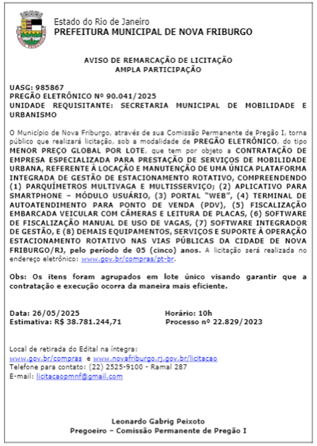 A Prefeitura de Nova Friburgo, através do Diário Oficial Eletrônico, publicou edital remarcando a licitação da terceirização do estacionamento rotativo nas ruas do município. A nova data licitação está marcada para 26 de maio.