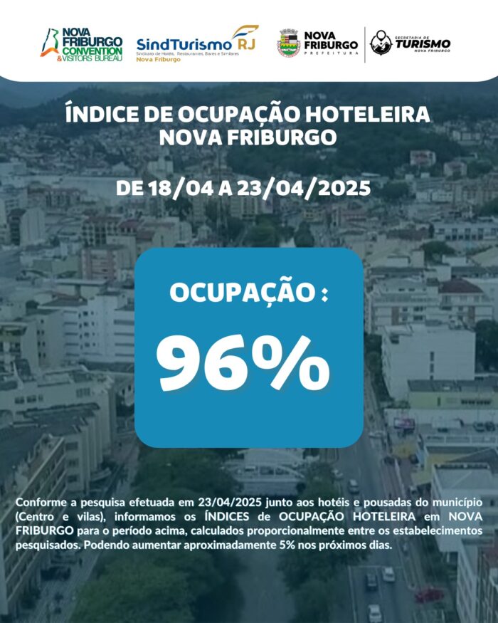 Ótima notícia para a economia friburguense: a rede hoteleira está com 96% das vagas ocupadas no superferiadão. O índice de ocupação foi divulgado pelo Nova Friburgo Convention Visitors Bureau, em parceria com SindTurismo RJ e Prefeitura.