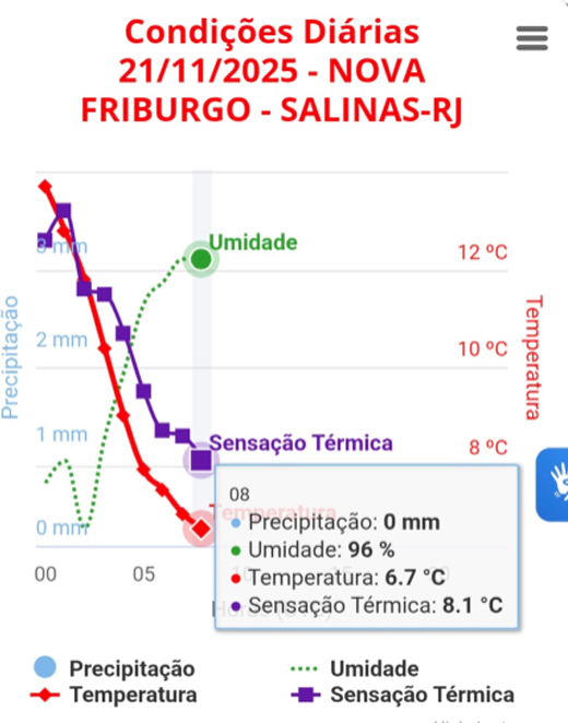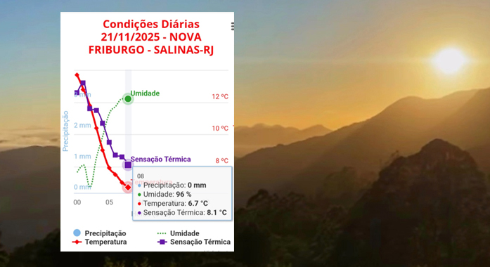 Fez frio em Friburgo no amanhecer desta sexta-feira, 21 de novembro, em especial na zona rural do município De acordo com o Inmet, a estação meteorológica de Salinas, no 3º distrito, aferiu 6.7 graus – com sensação térmica de 8.1 graus.