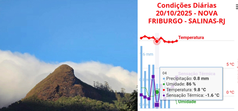De acordo com o Instituto Inmet, foi de mínima de 9.8ºC, mas a sensação térmica foi negativa, de -1.6 graus – temperaturas aferidas pela estação meteorológica de Salinas, no terceiro distrito friburguense.
