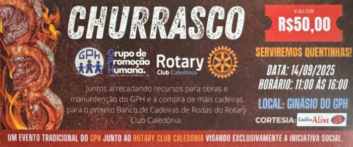 O Rotary Caledônia e o Grupo de Promoção Humana (GPH) vão realizar em 14/9, segundo domingo de setembro, um churrasco beneficente, cujo objetivo principal é a arrecadação de recursos para a compra de cadeiras de rodas destinadas a pessoas que necessitam.