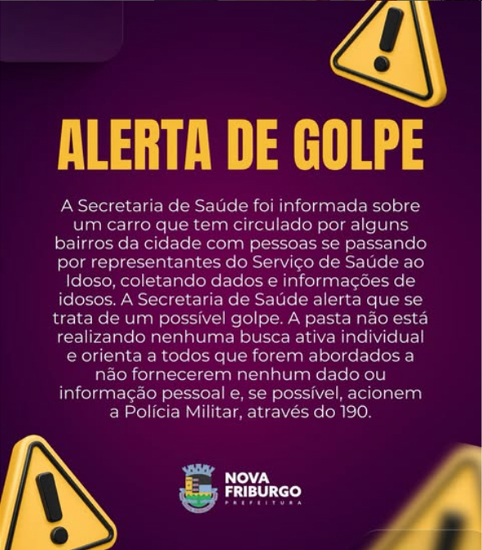 A Secretaria de Saúde de Nova Friburgo, através das redes sociais, emitiu alerta à população nesta quarta-feira, 3/9, sobre golpistas agindo no município: