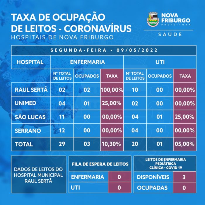 De acordo com o boletim oficial da Prefeitura, Nova Friburgo tem quatro pacientes internados com covid-19. A informação é referente a 9 de maio (segunda-feira). Três pacientes estão em enfermarias (dois no Raul Sertã e um na Unimed) e um no CTI (São Lucas).