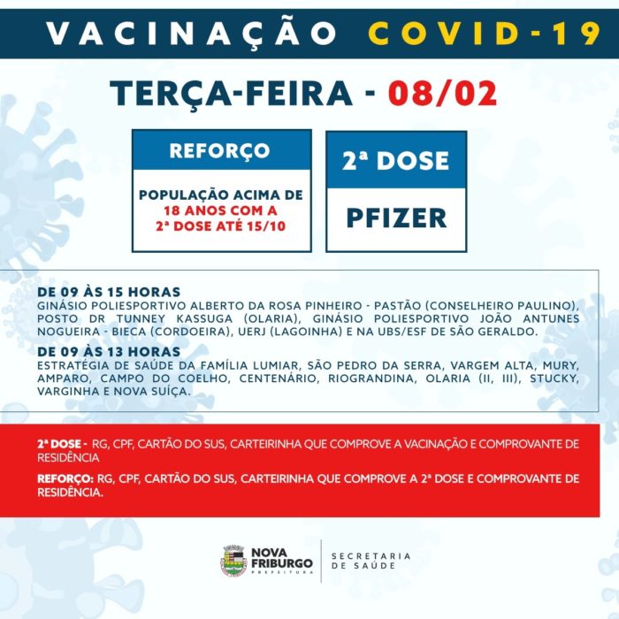 Dando prosseguimento à vacinação contra Covid-19 em Nova Friburgo, a Secretaria Municipal de Saúde realiza esta semana a campanha de imunização de reforço, segunda e primeira doses para todos os públicos – crianças, adolescentes, adultos e idosos.