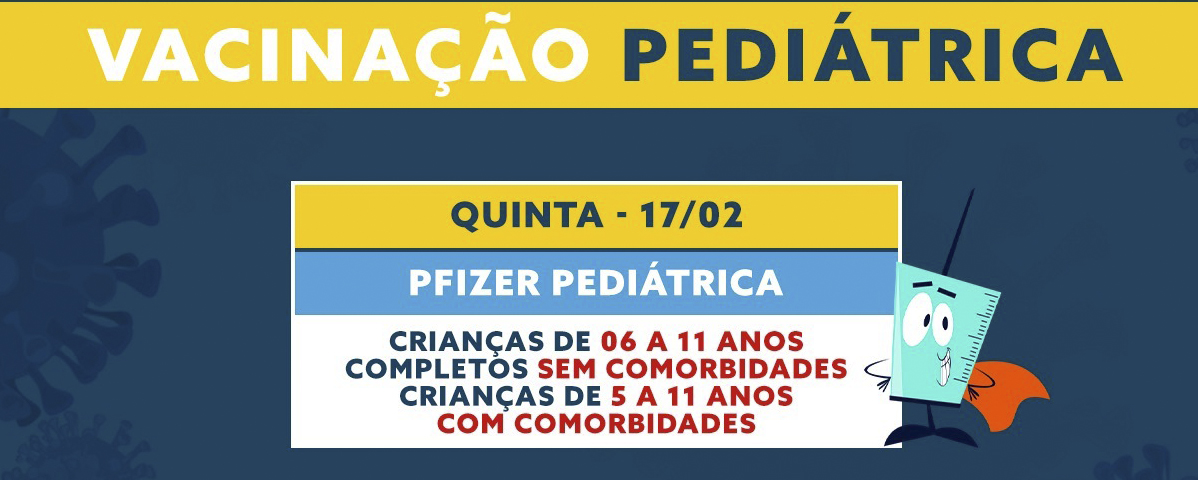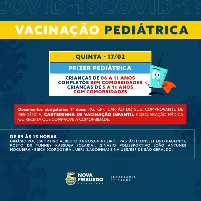 Nesta quinta-feira, 17 de fevereiro, a Secretaria Municipal de Saúde de Nova Friburgo vacina todas as crianças com mais de 6 anos, sem comorbidade ou deficiência permanente, e as crianças com mais de 5 anos, com comorbidades.