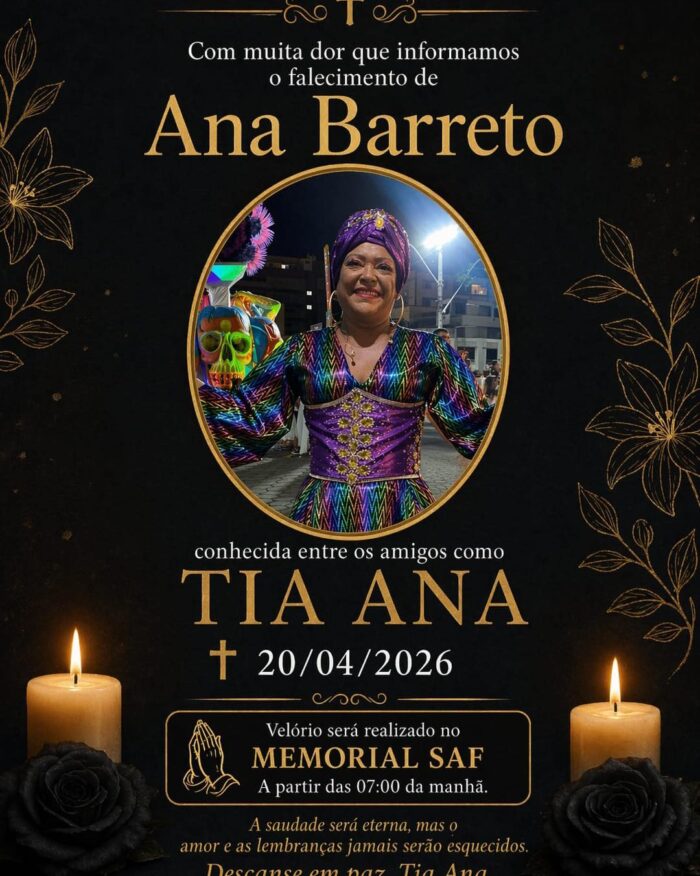 A Unidos da Saudade, escola de samba do Bairro Ypu, utilizou as suas redes sociais nesta terça-feira, 21/4, para lamentar o falecimento de uma de suas figuras ilustres: Ana Barreto, conhecida por Tia Ana. Ela havia completado 60 anos este mês e o velório acontece no Memorial da SAF, em Duas Pedras.