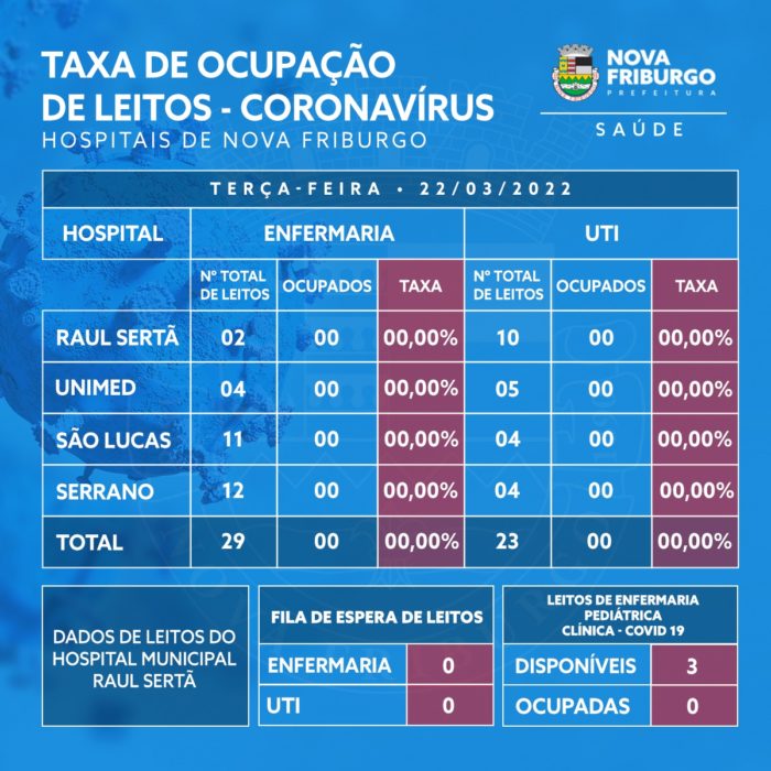 Outra boa notícia: Nesta terça, não havia nenhum paciente internado com covid no município. Ou seja, todos os 29 leitos de enfermaria e 23 leitos de CTI nos hospitais públuco e particulares estavam vazios.