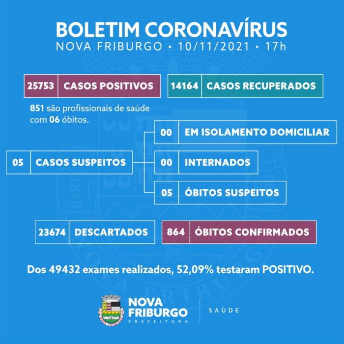 De acordo com o boletim epidemiológico divulgado pela Prefeitura nesta quarta-feira, 10/11, Nova Friburgo registrou mais um óbito por covid-19. “O falecimento ocorreu no último dia 5, em um hospital privado do município, mas só foi confirmado hoje (dia 10), através de exames, que a causa da morte foi a Covid-19”, afirmou o governo municipal. O número de mortes na pandemia subiu para 864.