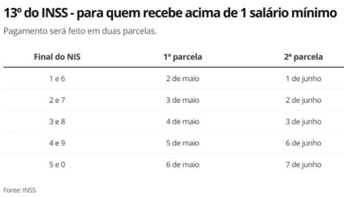 O INSS começa a pagar o benefício no dia 25 de abril. A segunda parcela será paga no mês seguinte, em maio.