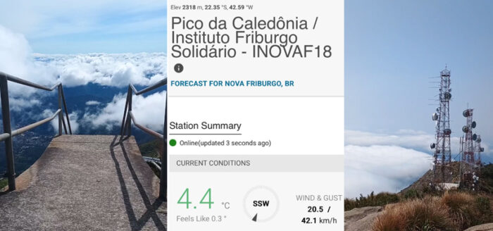 Um dos atrativos para aventureiros, o Pico do Caledônia voltou a registrar baixa temperatura neste dia 4 de julho: mínima de 4.4 graus e sensação térmica de 0.3 graus, às 8h57.