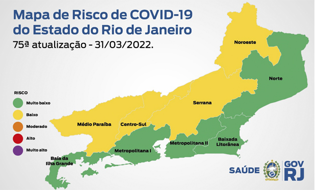 A 75ª edição do Mapa de Risco da Covid-19, divulgada nesta sexta-feira (01/04) pela Secretaria de Estado de Saúde, mostra que pela quarta semana consecutiva o estado do Rio de Janeiro está em bandeira verde, de risco muito baixo para Covid-19. A análise faz a comparação da décima segunda semana epidemiológica deste ano (SE 12), de 20 a 26 de março, com décima semana (SE 10), de 06 a 12 de março.