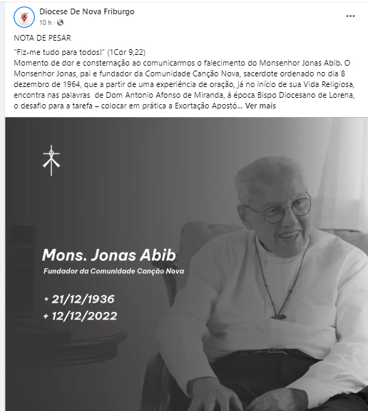REPERCUSÃO NACIONAL – A morte de Monsenhor Jonas Abib, importante líder religioso no país, repercutiu na comunidade católica. A Conferência Nacional dos Bispos do Brasil (CNBB) se manifestou nas redes sociais, assim como várias Arquidioceses e Dioceses – entre as quais a de Nova Friburgo, que reproduziu nota oficial em suas redes sociais.