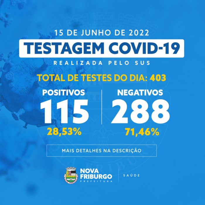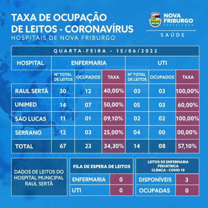 De acordo ainda com dados fornecidos pela Prefeitura, nesta quarta-feira, 15/6, eram 31 pacientes internados com covid-19 em hospitais de Nova Friburgo – 23 em leitos de enfermarias e 8 em CTIs.