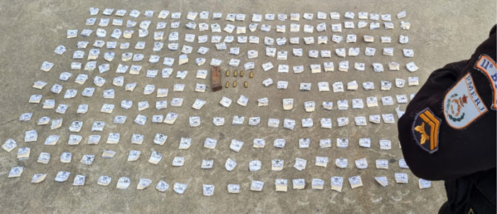Junto com as drogas (mais de 200 unidades), a Polícia Militar também recolheu sete munições e um carregador.
