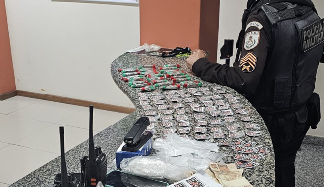 Policiais militares do 11º BPM apreenderam, em Duas Barras, 65 unidades de haxixe, 28 trouxinhas de maconha, além de dois rádios comunicadores, celulares, anotações do tráfico, sacolés plásticos e dinheiro em espécie neste final de semana.