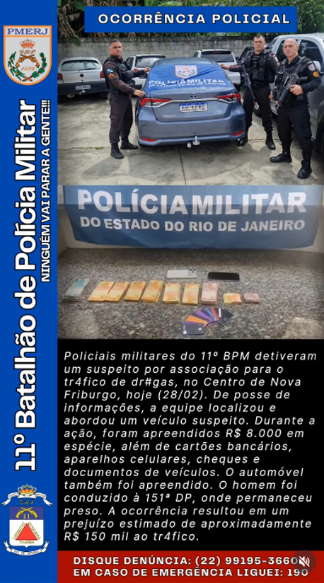 “De posse de informações, a equipe localizou e abordou um veículo suspeito. Durante a ação, foram apreendidos R$ 8.000 em espécie, além de cartões bancários, aparelhos celulares, cheques e documentos de veículos. O automóvel também foi apreendido. O homem foi conduzido à 151ª DP, onde permaneceu preso. A ocorrência resultou em um prejuízo estimado de aproximadamente R$ 150 mil ao tráfico”, diz a postagem.