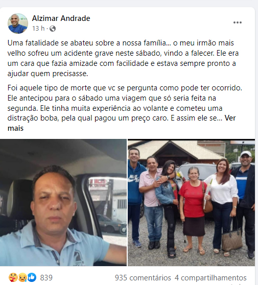 ” Uma fatalidade se abateu sobre a nossa família… o meu irmão mais velho sofreu um acidente grave neste sábado (18/12), vindo a falecer. Ele era um cara que fazia amizade com facilidade e estava sempre pronto a ajudar quem precisasse.