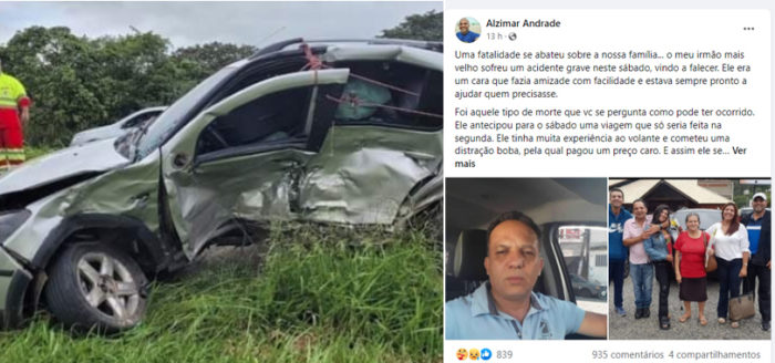 O irmão do sacoleiro, o analista do Judiciário, Alzimar Andrade, publicou mensagem em suas redes sociais relatando a tragédia: