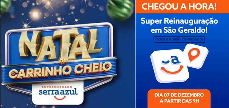 O Supermercados Serra Azul anuncia em suas redes sociais a reinauguração da loja de São Geraldo, a primeira da rede, neste sábado, 7/12, a partir das 9h.
