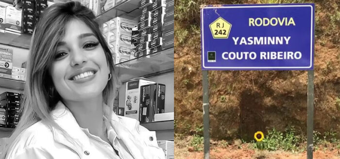 A placa que dá o nome de Yasminny Couto Ribeiro a um trecho da RJ-242 foi inaugurada segunda-feira, 26/1, em um ato de memória e homenagem. O local fica a poucos metros de onde a farmacêutica foi morta a tiros.