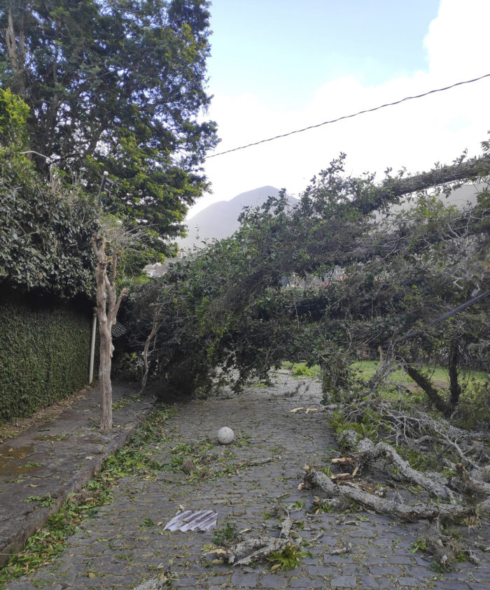 Tem árvores caídas em vários locais de Nova Friburgo – bloqueando vias e provocando falta de luz e internet. Também tem informações de alguns telhados avariados.